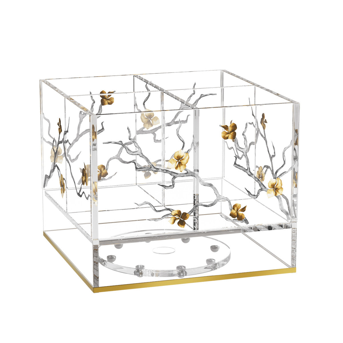 Upgrade your kitchen or dining room table with the Golden Branch Swivel Cutlery Holder - a luxurious addition to any dining experience. Featuring a swivel base, four compartments and a napkin holder on the bottom, this holder adds an elegant touch to your table setting. Say goodbye to messy tables and hello to sophistication with this exclusive piece.
