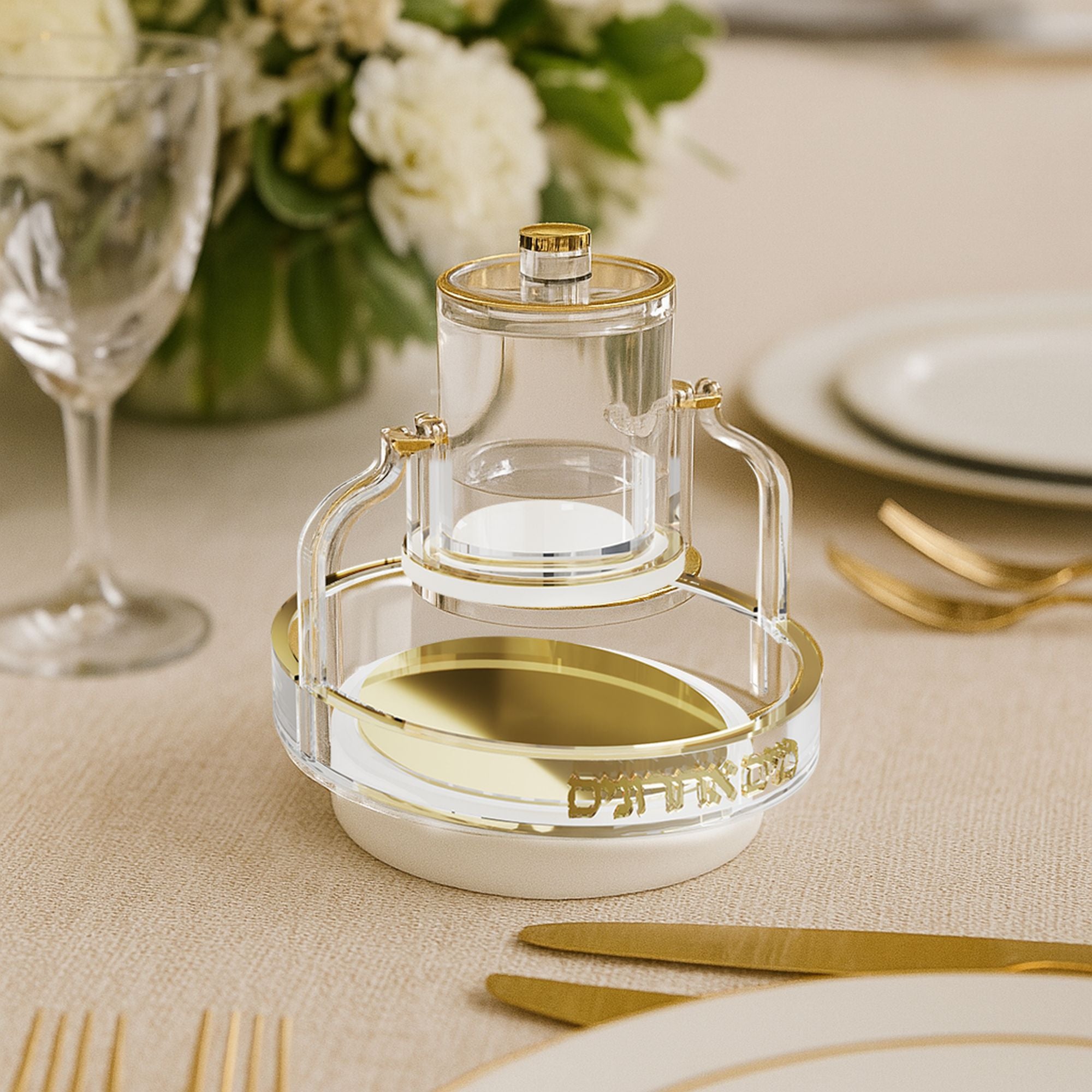 Elevate your table with the Swinging Mayim Achronim available in gold or silver. A beautifully crafted piece featuring a swinging built-in jug with spout and slanting mirror in the base that directs excess water into a discreet holder for a clean and seamless experience. A cutout in the base ensures effortless drainage. Made from high quality lucite and feauturing raised 3D borders and lettering add refined elegance. This design harmoniously blends functionality with sophistication, making it an ideal choice for honoring the holy Mayim Acharonim tradition.