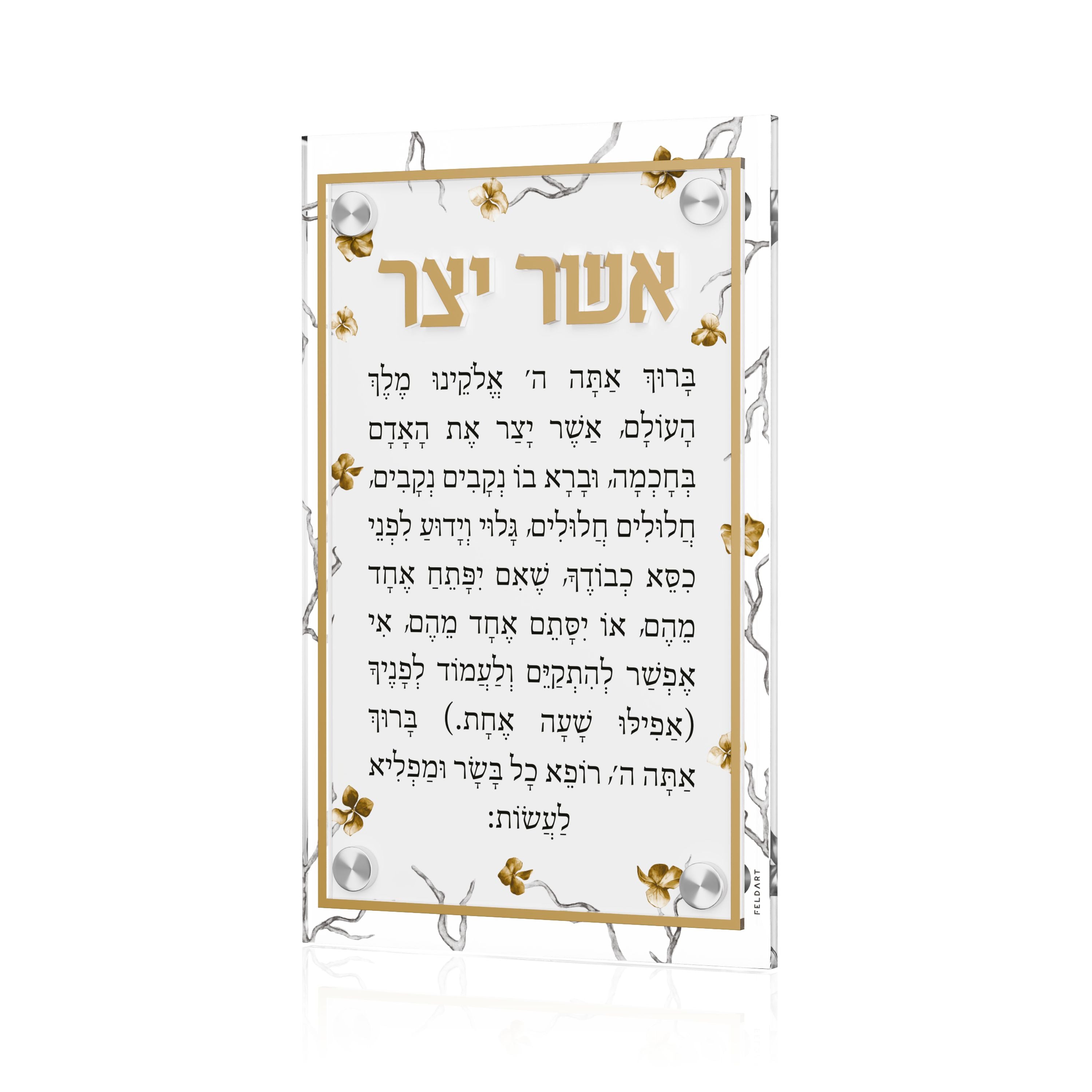 Experience an unparalleled level of elegance and sophistication with the Golden Branch Asher Yatzar wall decor available in classic Hebrew or Artscroll Interlinear edition. Crafted on high quality lucite with raised 3D titles and borders, and adorned with an interlinear translation - this is the perfect addition to any washing area.