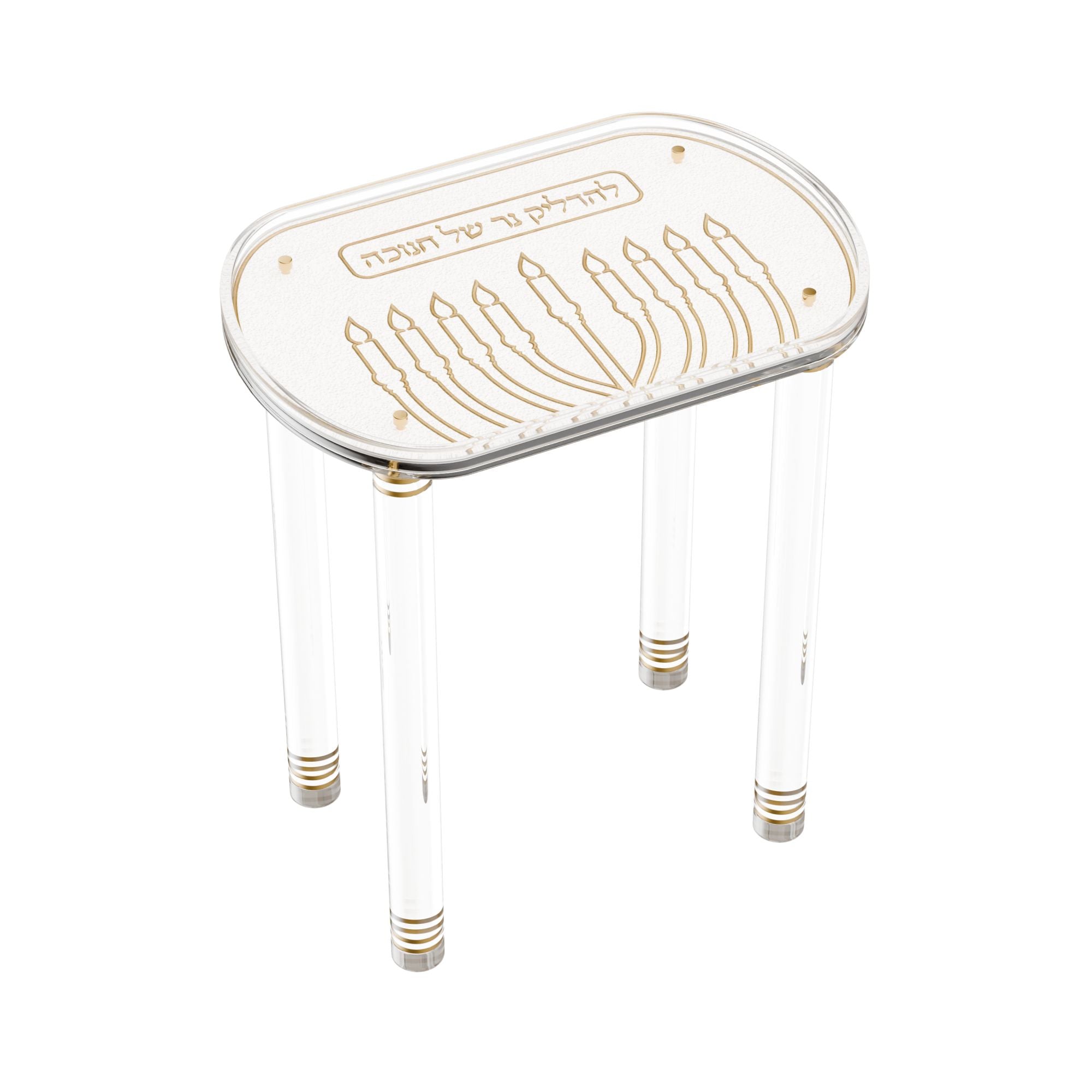 Elevate your Menorah lighting with the Leatherite Chanukah Table v2, a stunning showstopper designed to impress. Featuring sturdy solid legs for lasting stability and an elegant embroidered design on premium leather, all beautifully encased in crystal-clear lucite. The protective lip around the tabletop ensures functionality while maintaining a sleek look. Available in sophisticated silver or gold finishes, this upgraded edition combines artistry and durability to create the perfect Chanukah centerpiece.