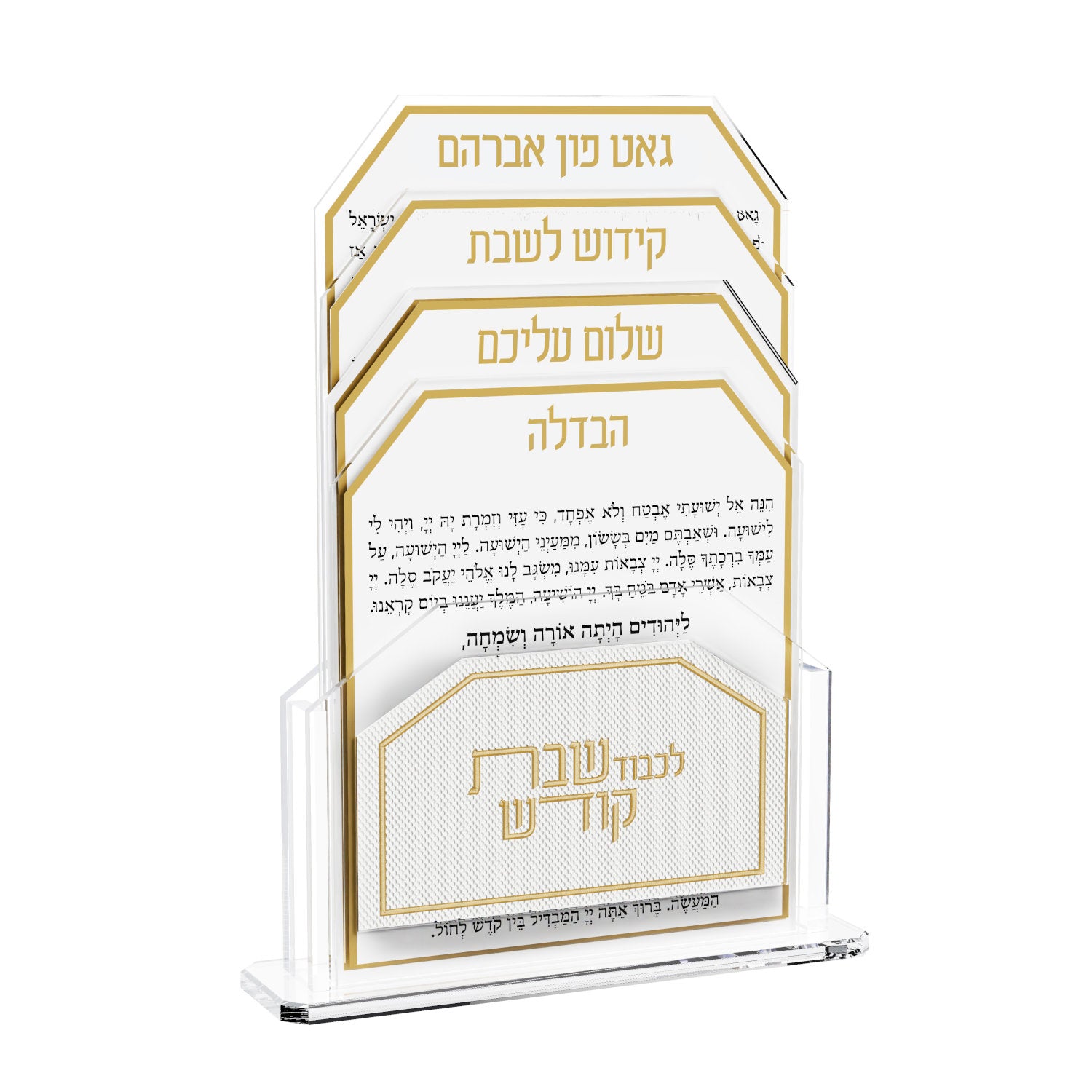 The Leatherite Shabbos Pack is the ultimate luxury gift! A set of four cards in an exquisite leatherite holder. This exclusive set contains cards for Gut Fun Avrohom, Shabbos Kiddush, Shalom Aleichem and Havdalah.