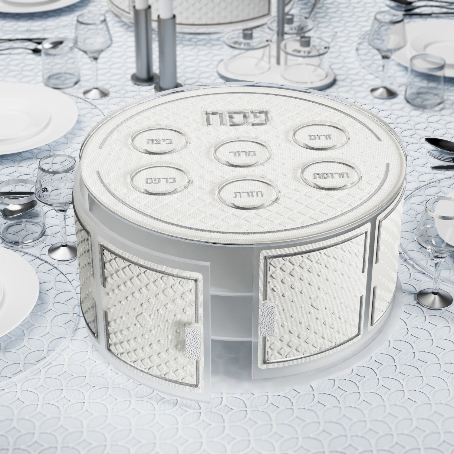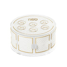 Introducing our Diamond Leatherite Tiered Kearah Seder Plate, the perfect showstopper piece for your Pesach table. Featuring three sections for matzos and a seder plate with indentations for each section on top, this exquisite tiered kearah is made with luxurious leather complete with delicate embroidery all enclosed in lucite. Available in gold or silver to fit any decor - elevate your Seder table with this exclusive design.