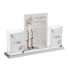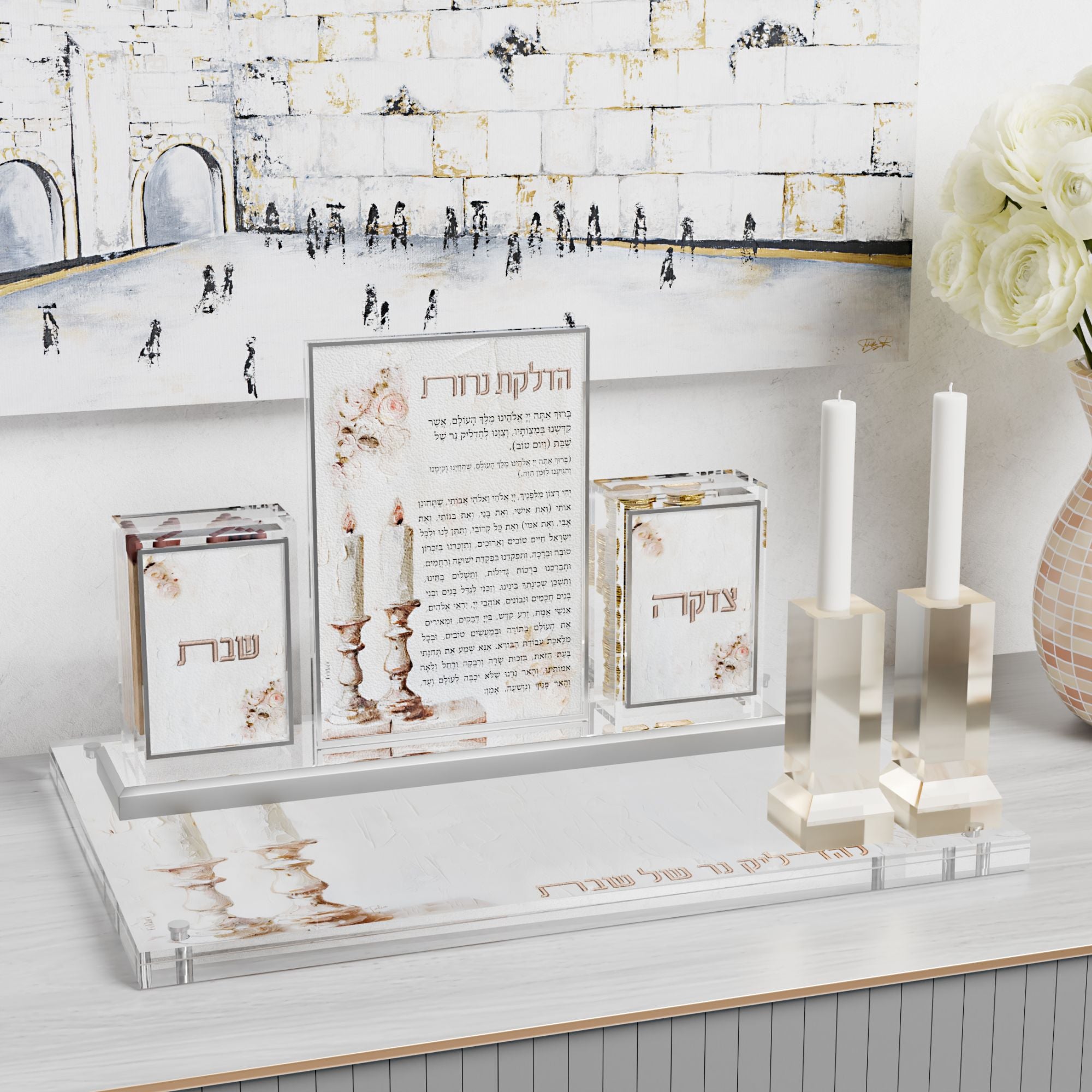 Indulge in opulence with the Leatherite Blush Hadlakos Neiros Set, the perfect combination of luxury and tradition. This unique new concept features a stunning Leatherite Hadlakos Neiros Brochos Card, Tzedakah Box, and Match Holder, all crafted with leather and 3d raised borders. This beautiful set is both beautiful and functional. A perfect gift for yourself or a loved one. Give the gift of elegance with this exclusive set.