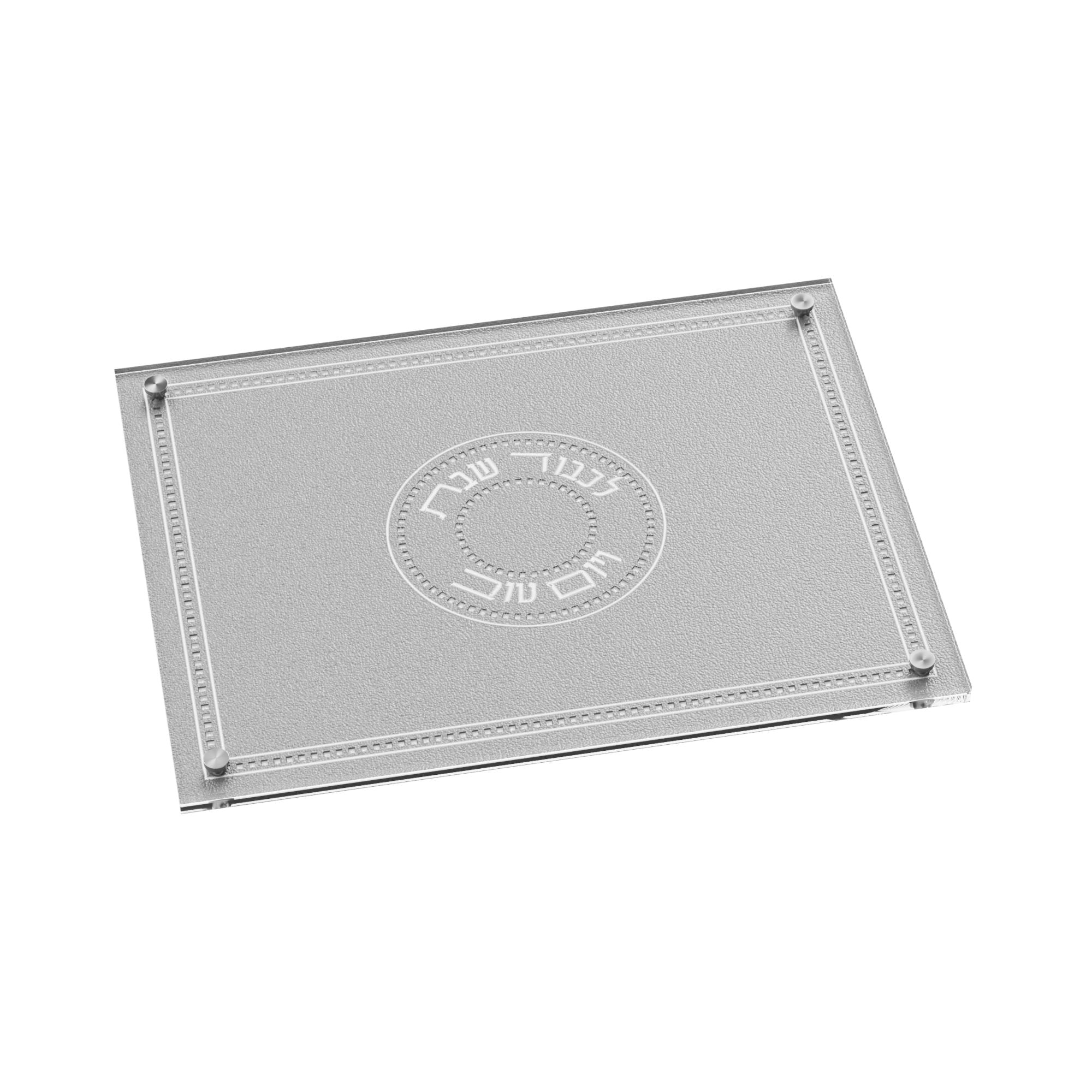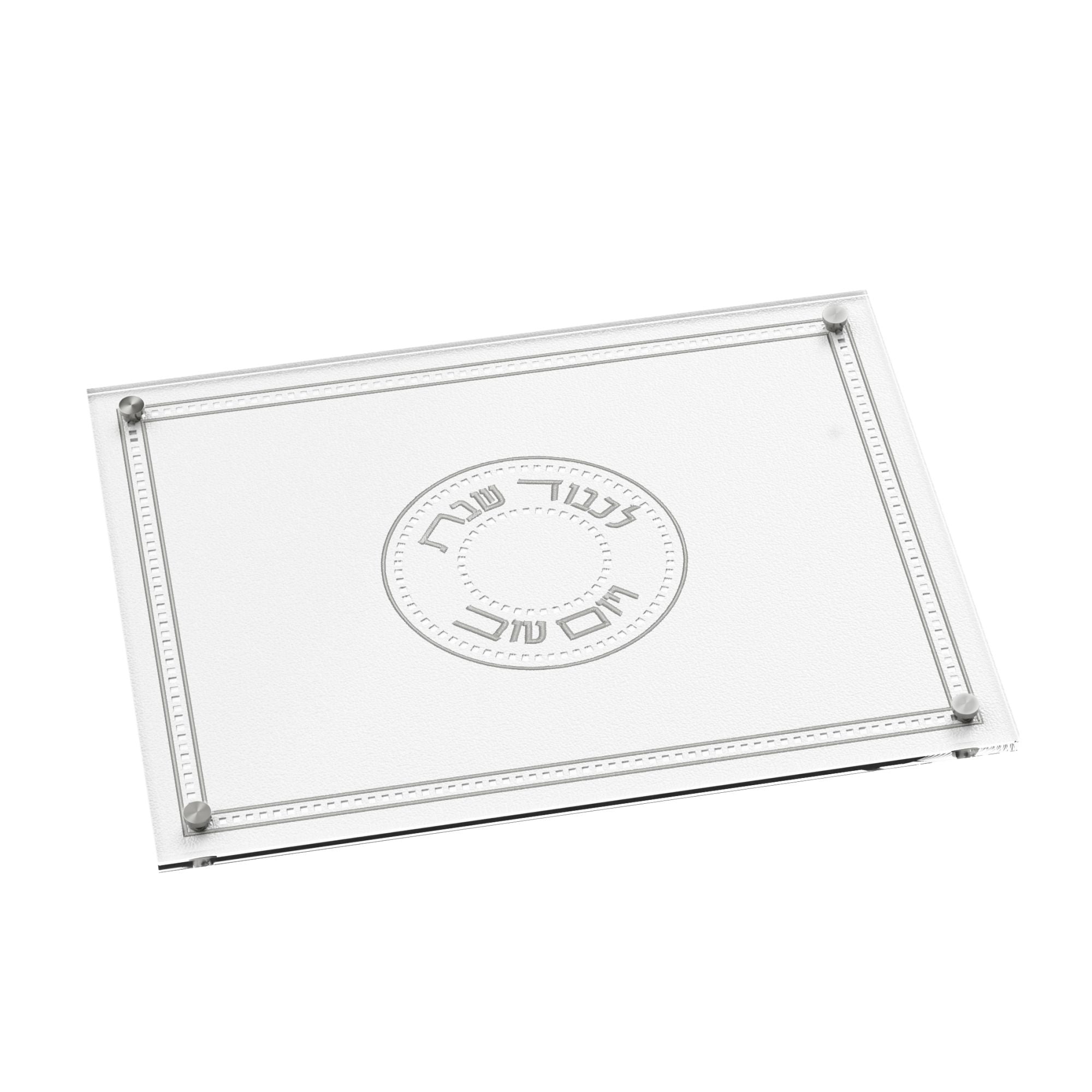 Indulge in luxury with the Leatherite Gilded Radiance Challah Board, exquisitely crafted with an embroidered leather design and topped with lucite and tempered glass. Available in gold, silver, full gold, and full silver, this board is the epitome of luxury and elegance. Elevate your Shabbos and Yom Tov table with this stunning piece of functional art.