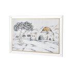 Indulge in luxury with the Leatherite Kever Rochel Painting - Gold Tranquillity. Exclusively painted for feldart, this stunning print on leather comes encased in a high quality lucite frame, showcasing the beauty of Kever Rochel. Available in 2 sizes and featuring a visually captivating design, this piece is the perfect addition to your home or office decor.