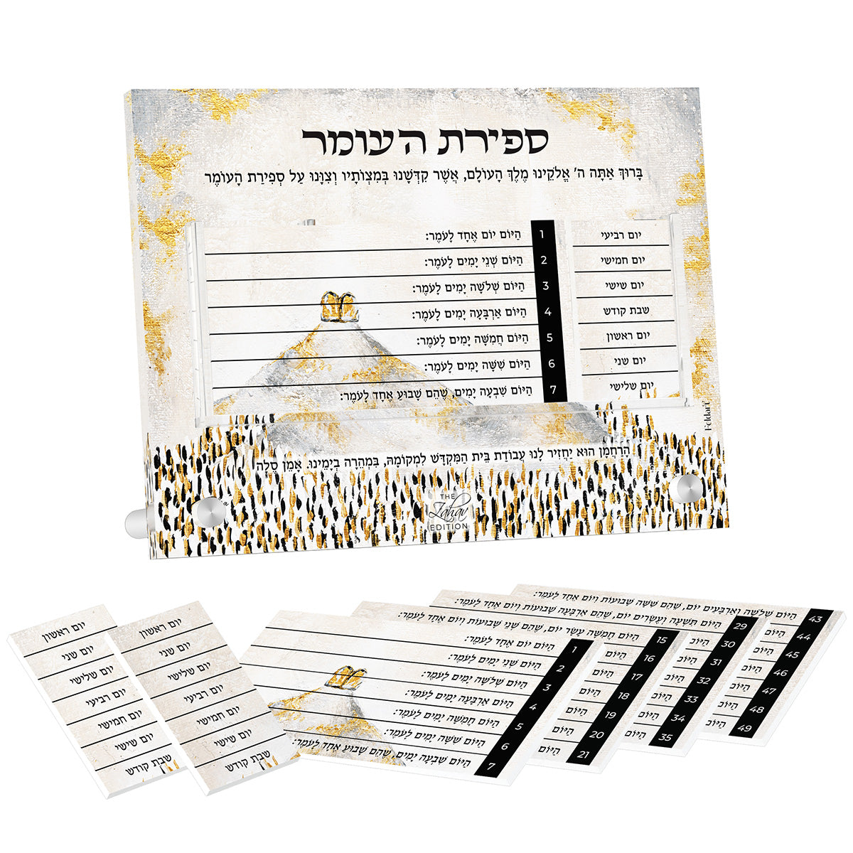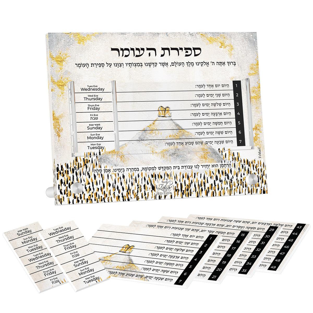 This innovative, exclusive chart has all the hebrew words you will need to count correctly. Easily find the correct yoim of that weeks Sefira Match the day + the day of the week easily. Can be used on Shabbos and Yom Tov so you never miss a day!