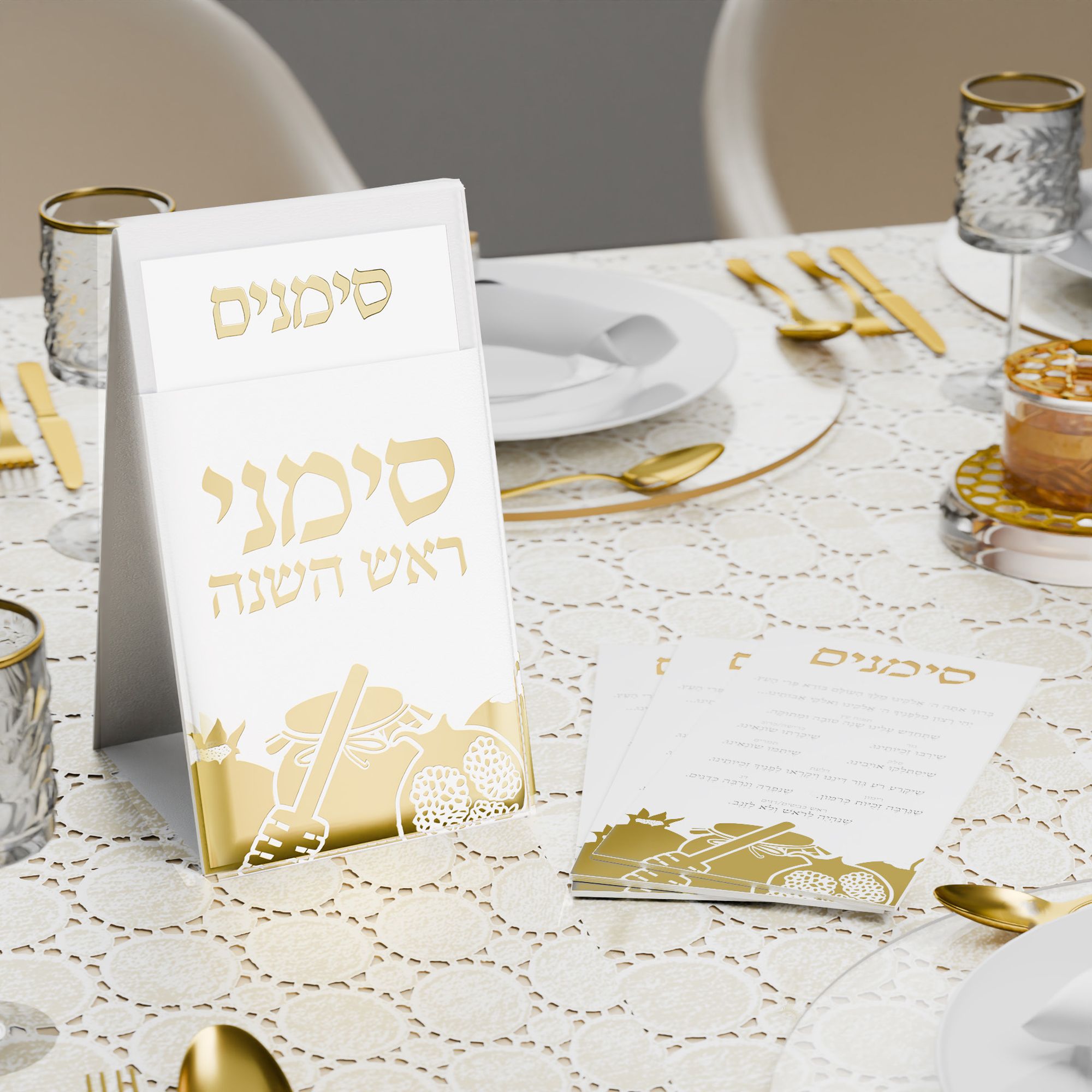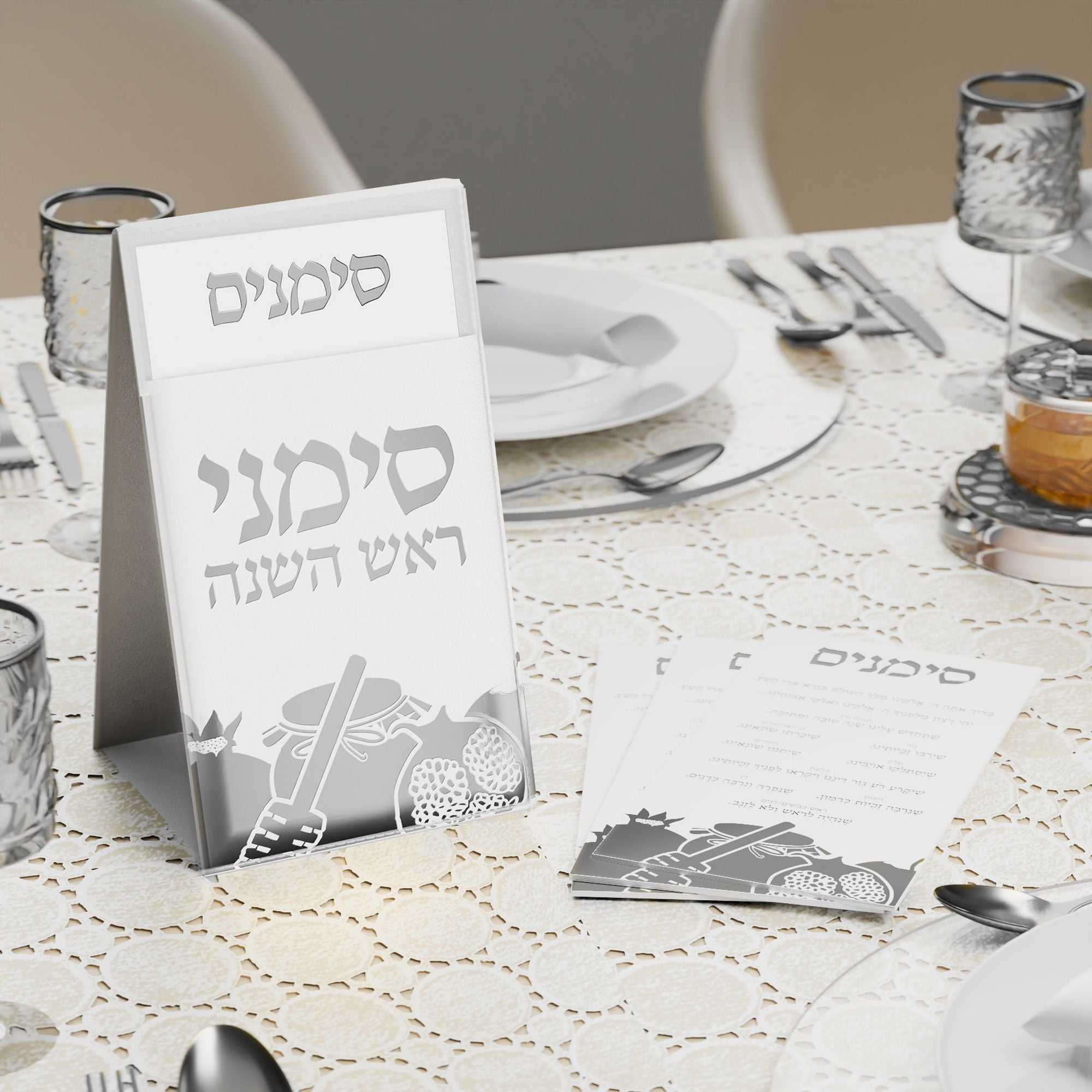 This refined Leather Pouch Simanim Set includes four beautifully crafted leather cards featuring the traditional Simanim Yehi Ratzons, elegantly stored in a leather pouch with a debossed title. Available in gold or silver designs, the pouch and cards are adorned with stunning debossed artwork. A tasteful and meaningful set to enhance your Rosh Hashanah table decor.