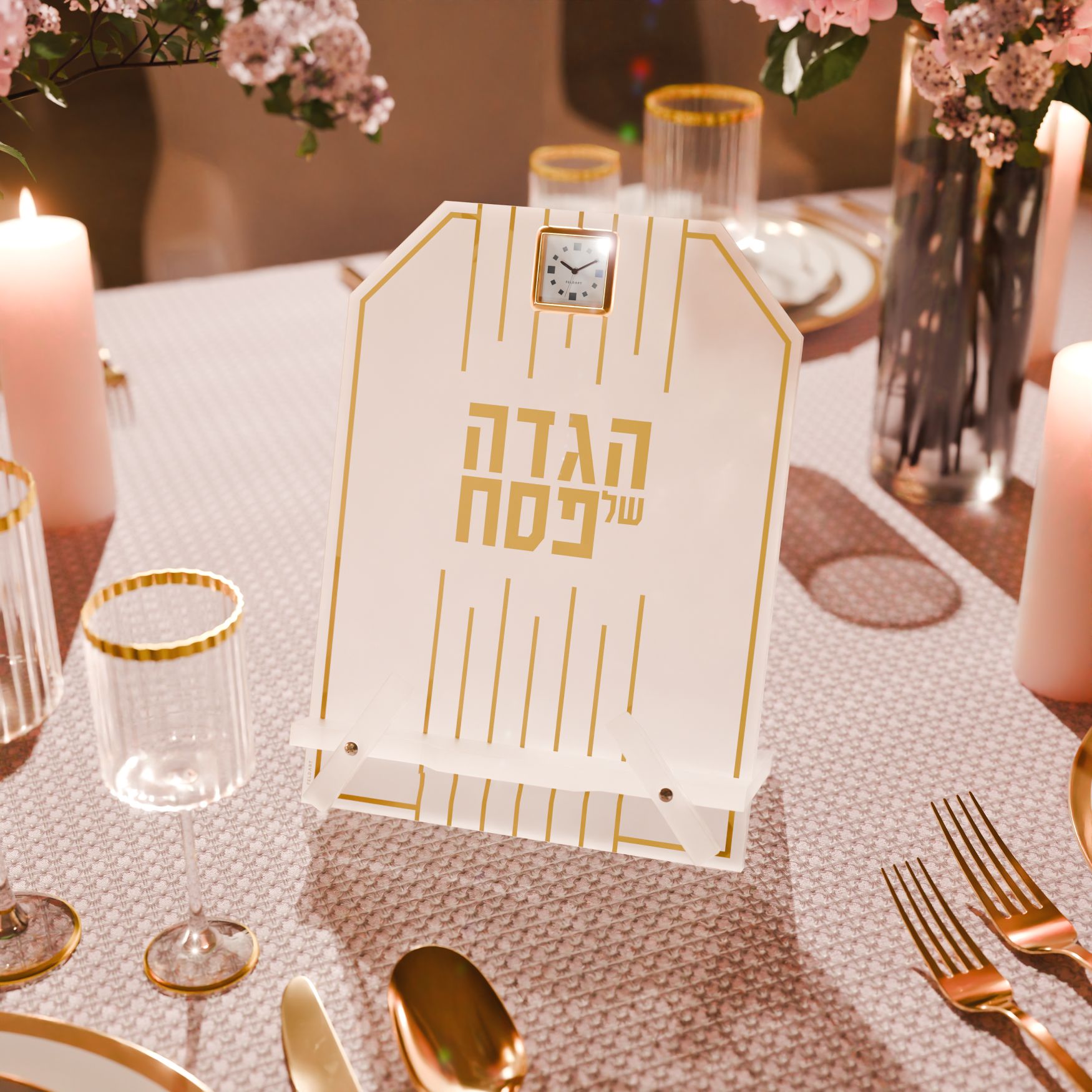 Display your Haggadah with elegant sophistication with the Linear Haggadah Stand. Its clean, geometric design complements any table setting while the integrated clock adds practical elegance - perfect for timing your Afikomen perfectly! Choose between silver or gold finishes to match your aesthetic. A modern take on traditional Judaica that elevates your seder table.
