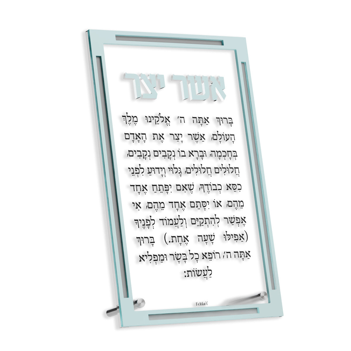 This Classic Asher Yatzar Tabletop Card printed on clear frost acrylic with raised 3D title and borders adds practicality, creating a tasteful yet functional accessory for use in any room.