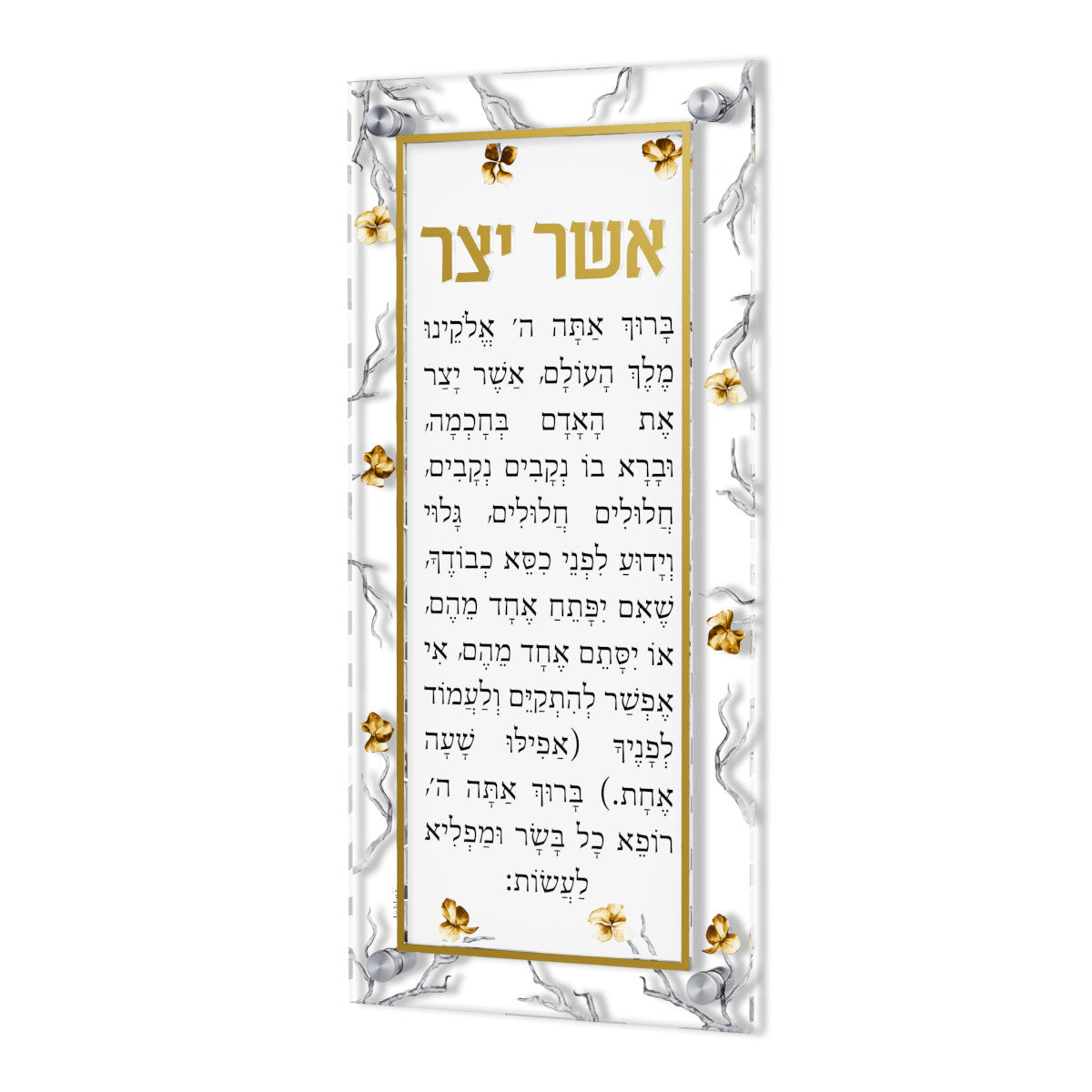 Experience an unparalleled level of elegance and sophistication with the Golden Branch Asher Yatzar wall decor available in classic Hebrew or Artscroll Interlinear edition. Crafted on high quality lucite with raised 3D titles and borders, and adorned with an interlinear translation - this is the perfect addition to any washing area.