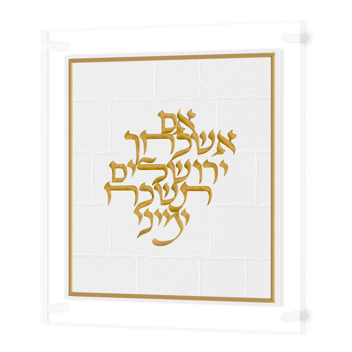 Enrich your home with the luxurious Leatherite Im Eshkocheich. Elegantly crafted with leather enclosed between two pieces of Lucite. Its unique design is intricately embroidered onto luxurious leather, creating an exquisite and unparalleled beauty. "If I forget Yerushalayim, let my right hand forget its skill".