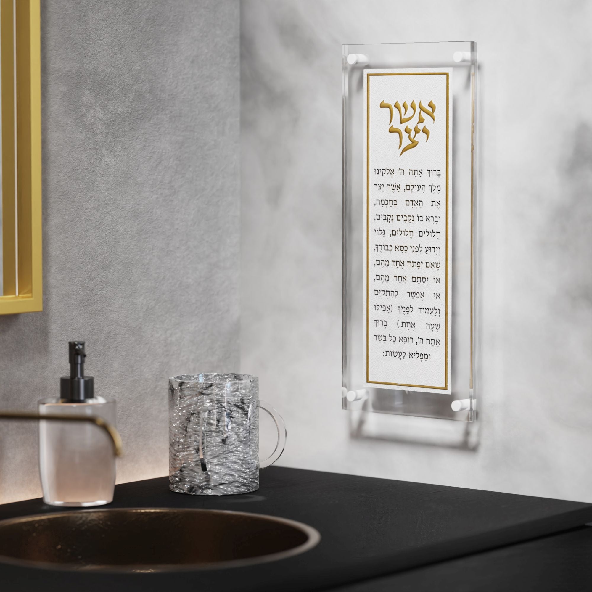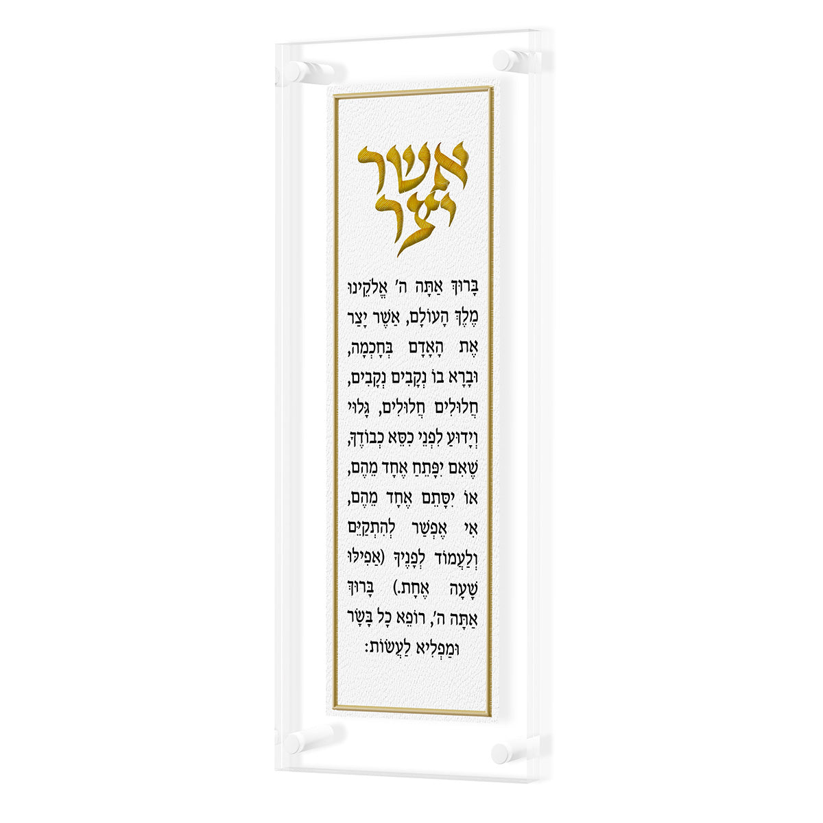 Enrich your home with the luxurious Leatherite Asher Yatzar. Elegantly crafted with leather enclosed between two pieces of Lucite. Its unique design is intricately embroidered onto luxurious leather, creating an exquisite and unparalleled beauty.